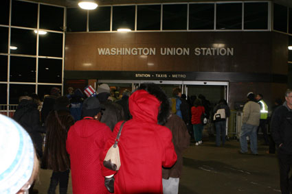 After picking up a friend in Federal Hill, we pulled into the parking garage at Baltimore’s Penn Station, surprised to find spaces still available. We clutched our commemorative Barack Obama MARC train tickets and climbed the staircase from the underground garage. The line snaked out of the front doors of the station and onto the sidewalk. A Baltimore City police officer directed us inside the station for the line for the P4 train, scheduled to depart at 6:20.