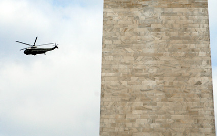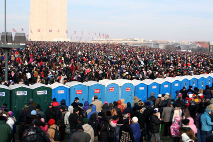 We ducked under a chain link fence, walked past The Great Wall of Porta-Potties and found a spot in a ditch right about at Jefferson Drive between the Washington Monument and 14th Street. It didn’t take long for the rest of the yard to fill in. Before long, there was literally not space for a single body in the grassy area in front of the Washington Monument – a field that is about three blocks tall and one block wide. That’s to say nothing of the football fields upon football fields filled with people between the Monument and the Capitol. A few brave spectators climbed on top of the porta-potties for a better view, putting an incredible amount of trust into the structural integrity of a plastic room filled with unpleasantries.