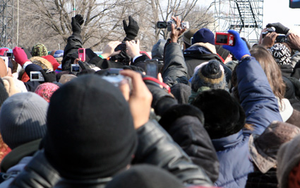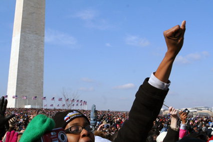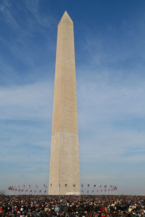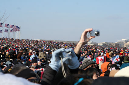 At 14th Street, the crowd pushed through a bottleneck and turned down Independence Avenue. Here we had our first look at the crowd. The lawn surrounding the Washington Monument was shoulder-to-shoulder people. A sea of smiling faces, knit caps and scarves.